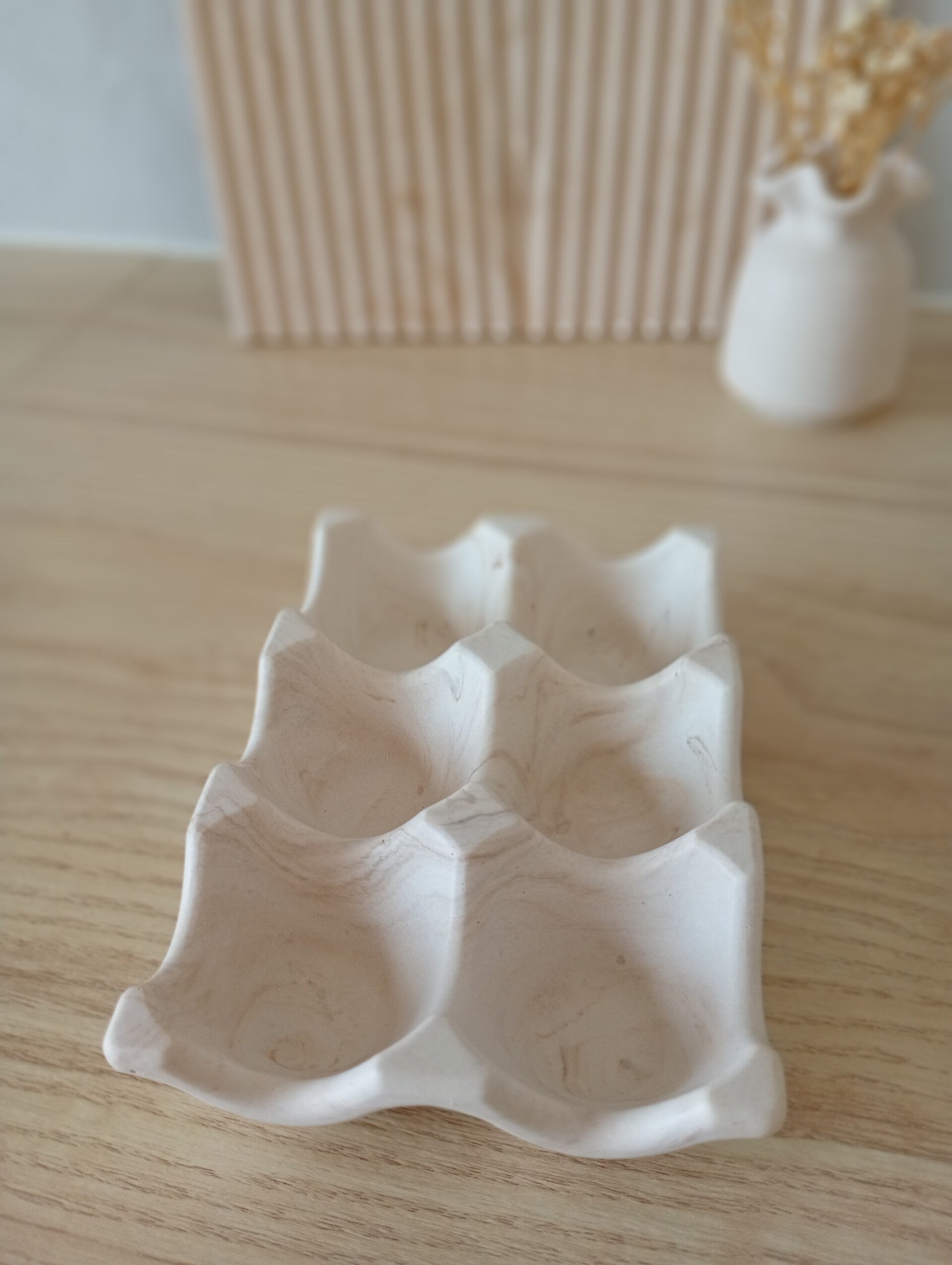 Découvrez notre pièce artisanale en jesmonite, conçue pour offrir une touche d’élégance et de modernité à votre cuisine. Pensée pour organiser vos œufs avec style, elle associe design minimaliste et fabrication soignée.